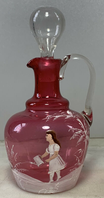 Title (ebay affiliate link): Antique Mary Gregory Cranberry Glass Cruet Applied Handle Girl Watering Plant