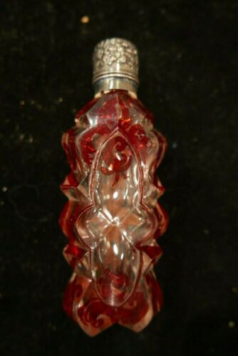 ANTIQUE RUBY FLASHED PERFUME BOTTLE W/ STERLING TOP W/ HALLMARKS