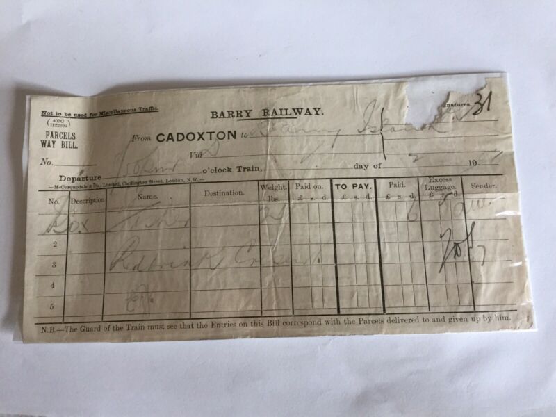 Railway Ephemera Barry Railway Way Bill Cadaxton
