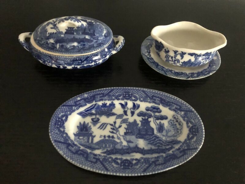 Vintage Willow Blue Childs Platter Gravey Bowl And Dish With Lid Lot Of 3