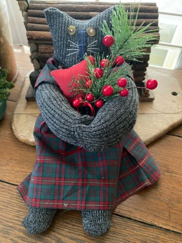 Title (ebay affiliate link): Primitive Kitty Cat Francie Christmas Cat with Greenery and Berries and Ornie