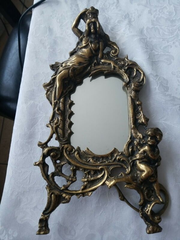 Title (ebay affiliate link): Vintage Victorian Gothic Style Gold Metal Cherub Angel Queen Easel Vanity Mirror