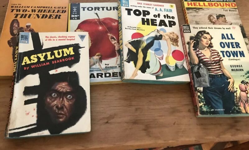Title (ebay affiliate link): 6 vintage paperbacks Great Cover Art pulp Sex Torture Asylum Motorcycles