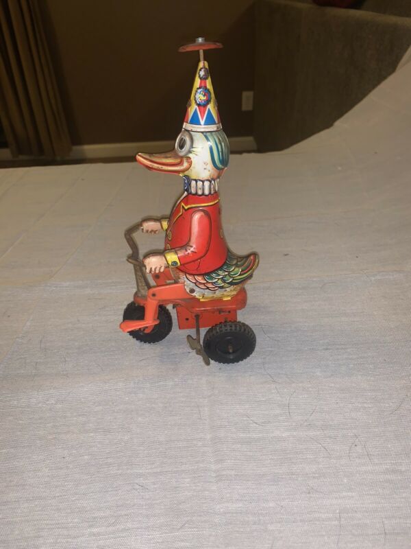 Title (ebay affiliate link): Vintage Duck on a Bike Wind Up Tin Toy w/ Spinning Fan Hat