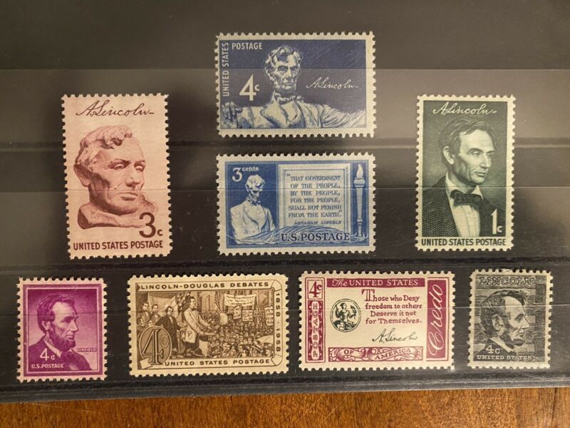 Title (ebay affiliate link): 8 Abraham Lincoln US postage stamps, depicting major events of his life.