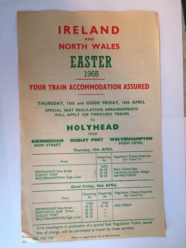Title (ebay affiliate link): Railway Handbill Excursions To Ireland & North Wales Easter 1965