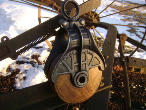 Title (ebay affiliate link): Antique Vintage Cast Iron Myers OK Hay Trolley Line Pulley Barn Farm Tool