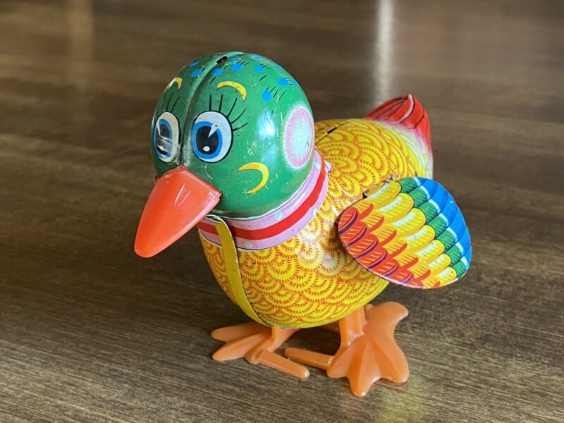 Title (ebay affiliate link): Tin Wind Up Toy Colorful Walking Clucking Bird Duck Vintage Japan Original Litho