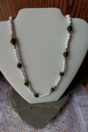 Beaded hard plastic White/Blue/gold Beaded Necklace Costume Jewelry Milk Glass