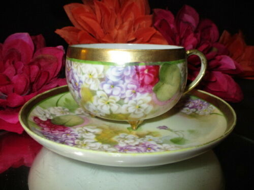 CUP SAUCER NIPPON FOOTED HAND PAINTED GOLD WINE PURPLE WHITE VIOLET CLUSTERS
