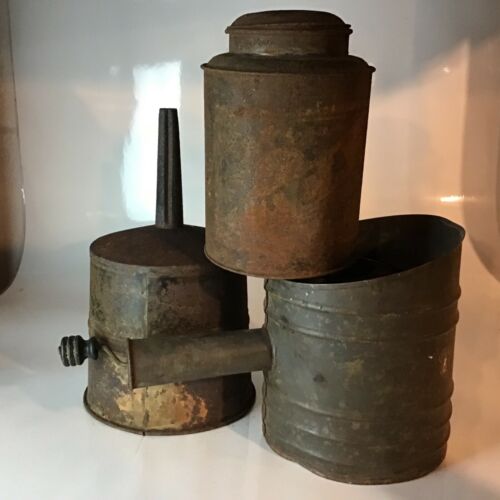 3 Antique kitchen primitives tea tin old flour sifter early funnel rusty rusty