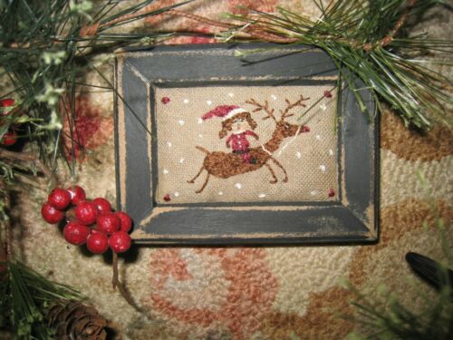 Primitive tiny Sampler~She Rides Her Reindeer ~Early Quilt ~ Christmas Folk Art