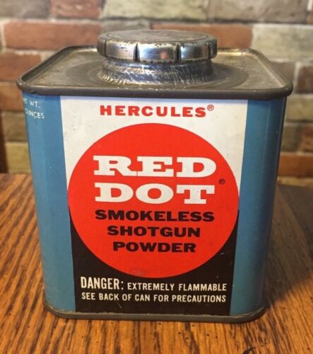 Title (ebay affiliate link): Vntg HERCULES POWDER CO RED DOT SMOKELESS SHOTGUN POWDER HUNTING TIN ADVERTISING
