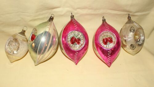 Lot 5 Vintage Antique Double Indent Teardrop Mercury Glass Holiday Christmas Orn