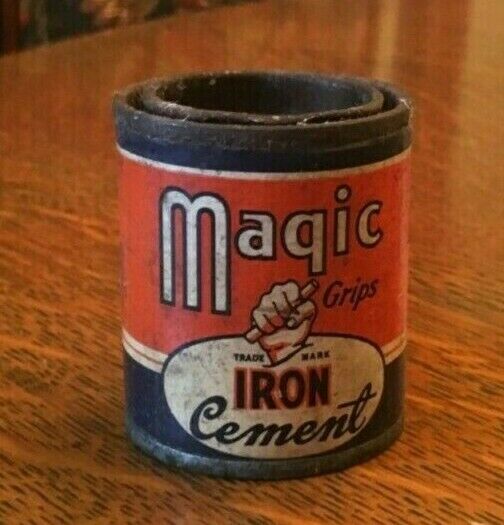 Title (ebay affiliate link): GREAT Vintage DECO Design Paper Label TIN of Magic Iron Cement 3 Oz Still Full