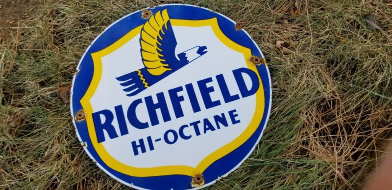 " Us Richfield high octane ." 12x12 vintage porcelain Steel pump plate sign.