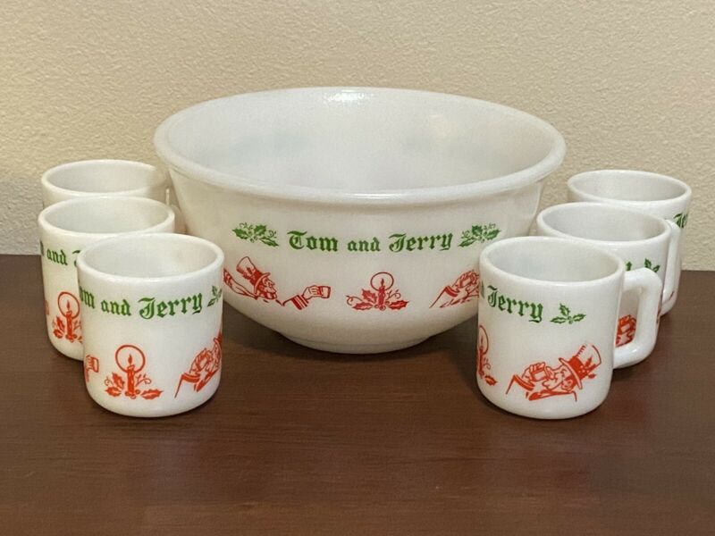 Vintage Hazel Atlas Tom And Jerry White Milk Glass Eggnog Punch Bowl With 6 Cups