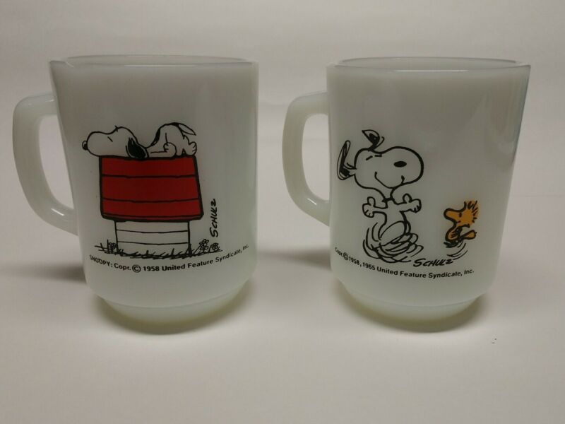 Lot of (2) Vintage Snoopy Fire King Coffee Mugs Cups Milk Glass Anchor Hocking
