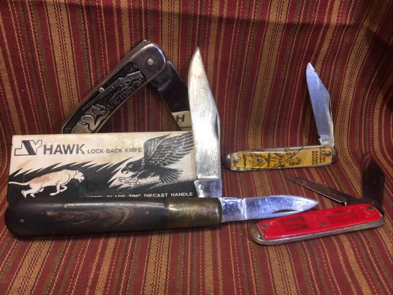 4 Vintage Pocket Knives.daniel Boone-coke Hawk Sab Lock & Bullet 13-047E-lot