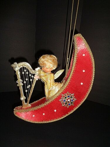 VINTAGE ANGEL PLAYING HARP ON RED MOON MUSIC BOX SILENT NIGHT JAPAN