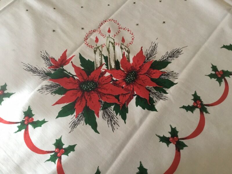 Title (ebay affiliate link): Vintage Christmas Tablecloth Poinsettia Candles Holly Berries