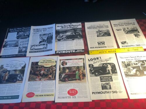 Title (ebay affiliate link): 10 VINTAGE PLYMOUTH PRINT ADS ORIGINALS 6.5"x10" VG 1935-1940 BW & Color