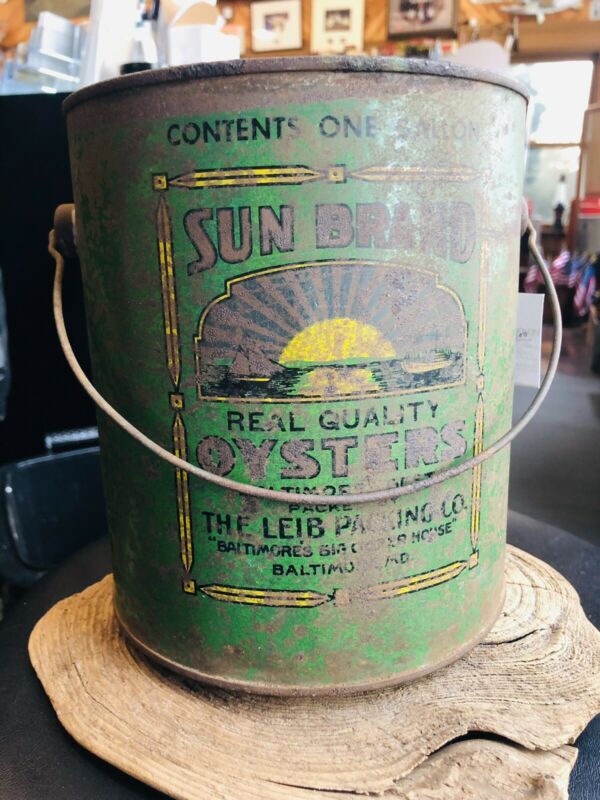 Title (ebay affiliate link): Vintage Sun Brand Big Oyster House Gallon Tin Can Baltimore MD 27 Bail Handle