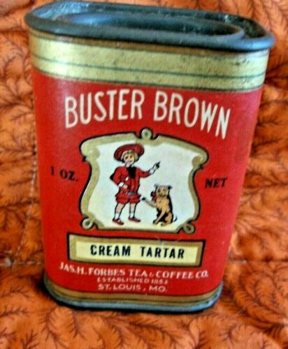 Title (ebay affiliate link): VINTAGE BUSTER BROWN CREAM TARTAR TIN,FORBES TEA & COFFEE CO.,ST. LOUIS,MO.