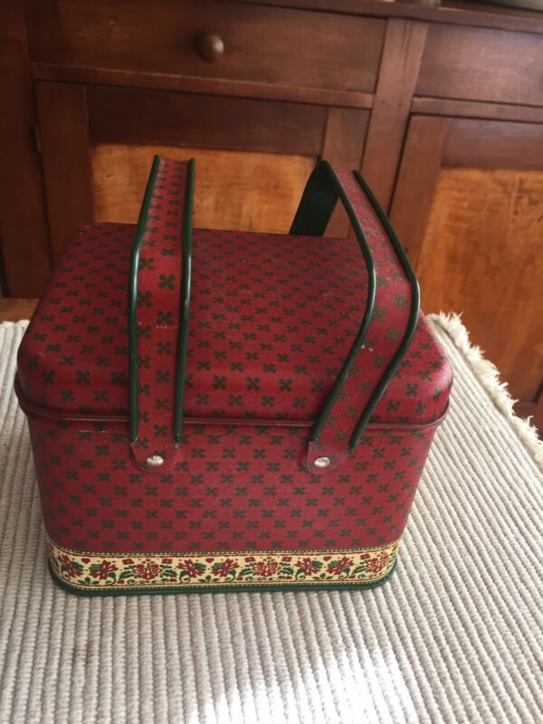 Title (ebay affiliate link): VINTAGE POTPOURRI PRESS CHRISTMAS RED GREEN TIN BASKET HANDLES