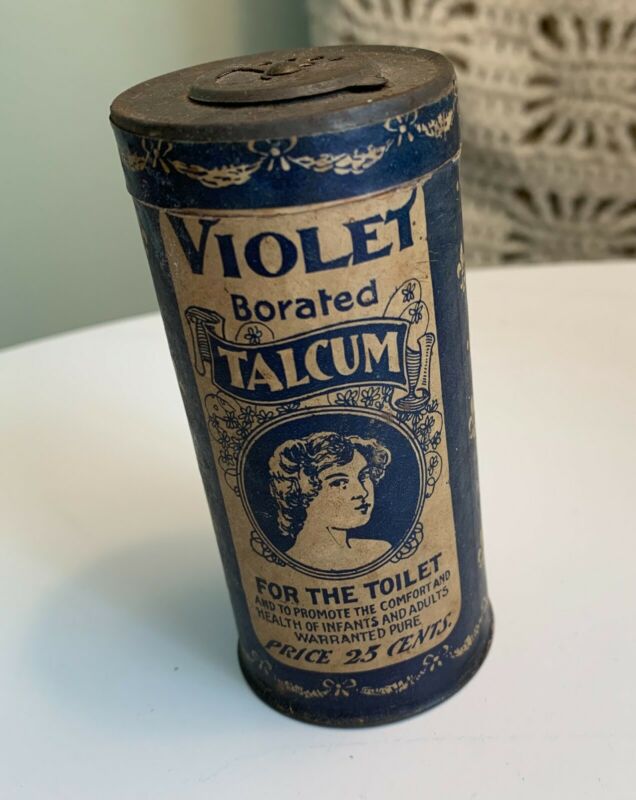 Title (ebay affiliate link): VINTAGE BORATED PERFUMED TALCUM POWDER- GIRL PRINTED LITHO TIN BOX Pure Food Co.