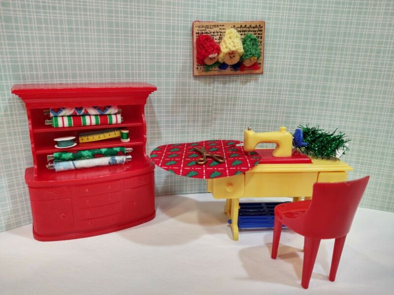 Renwal CHRISTMAS THEME TREADLE SEWING SET Vintage Miniature Dollhouse Furniture