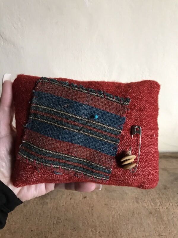 Title (ebay affiliate link): Antique Inspired Linsey Woolsey Turkey Red Blue Pin Cushion Bone Buttons AAFA #2