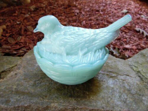Title (ebay affiliate link): French Portieux Vallerysthal Blue Milk Glass Robin On Basket / Bird On Nest