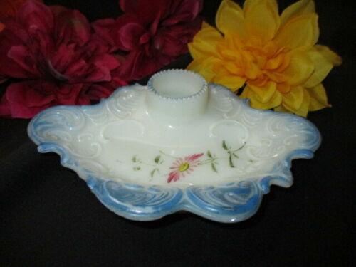 Title (ebay affiliate link): VICTORIAN LADY''S EAPG MILK GLASS INKWELL LACY SCROLLS BLUE ENAMEL PINK ASTER
