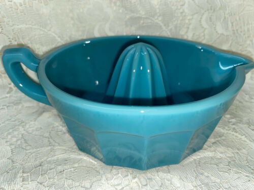 Title (ebay affiliate link): Blue Milk Glass lemon Juicer hand reamer fruit orange dish citrus pour spout 8"