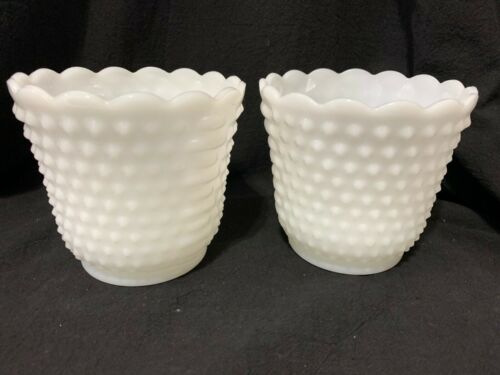Pair Anchor Hocking Fire King Oven Ware Milk Glass White Hobnail Vases 4.25"