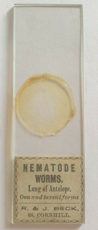 Title (ebay affiliate link): VERY FINE ANTIQUE MICROSCOPE SLIDE NEMATODE WORMS LUNG OF ANTELOPE BY R & J BECK