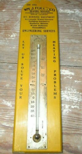 Vintage Wm J Foll Wood Heating Advertising Thermometer Wooden Excellent Cond.