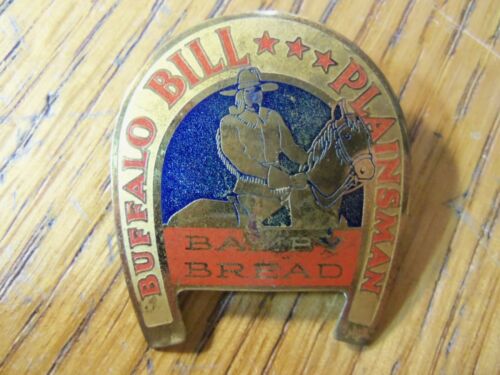1930s METAL PINBACK BUTTON BUFFALO BILL PLAINSMAN BAMBY BREAD ON A HORSE