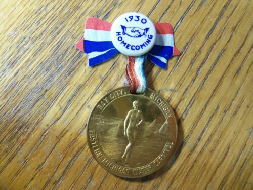 1930 ADVERTISING PINBACK BUTTON RIBBON EASTERN MICHIGAN WATER CARNIVAL BAY CITY