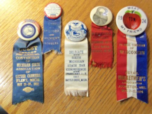 Title (ebay affiliate link): 5 PINBACK BUTTONS RIBBON BADGE STATE TAX CONF. LETTER CARRIERS, HARDWARE,BANKING