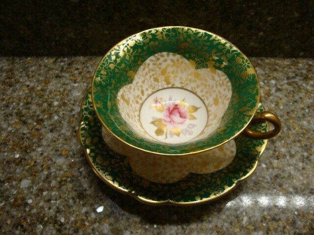 Foley tea cup and saucer PINK ROSE green teacup gold #3283 E