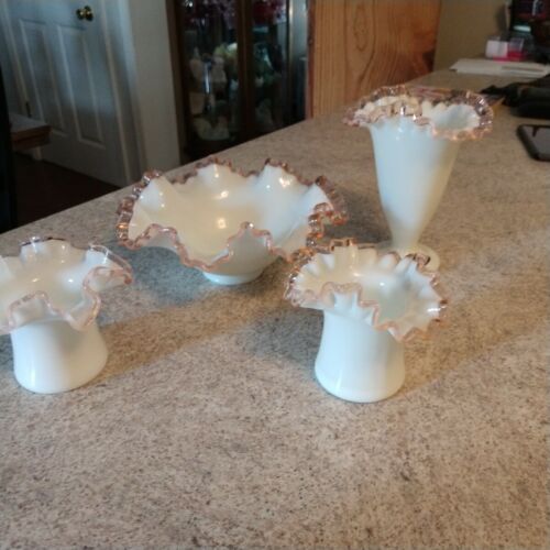 Title (ebay affiliate link): 4 Fenton Pink Rose Crest Milk Glass Bowl , Vase , 2 Hat shaped Vases