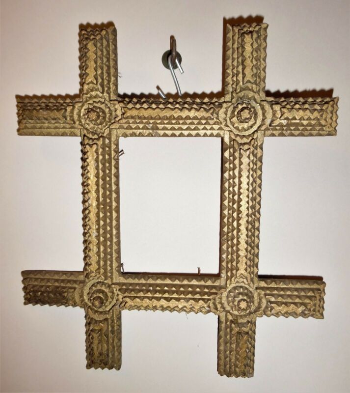 Title (ebay affiliate link): Antique TRAMP ART folk art crossed corner picture frame in old mellow gold paint