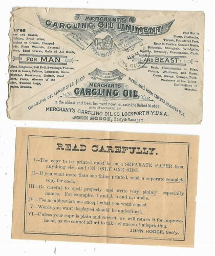 Old Quack Medicine Ad Envelope Merchants Gargling Oil Liniment Lockport NY Hodge