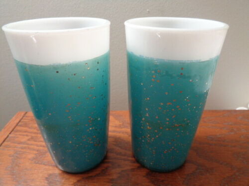 Title (ebay affiliate link): 2 Vintage Glamalite Milk Glass w Bllue Rubber Glitter Coated Exterior Tumblers