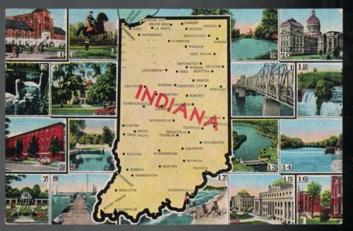 Title (ebay affiliate link): VINTAGE 1940 GREETINGS FROM INDIANA WITH MAP & MULTIPLE VIEWS POSTCARD