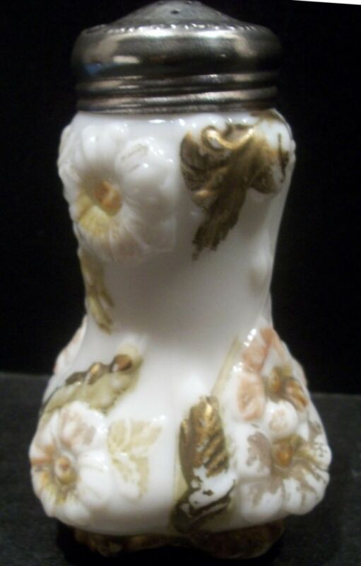 DITHRIDGE MILK GLASS SALT OR PEPPER SHAKER - BLOOMING WILD ROSE - 4 1/2"