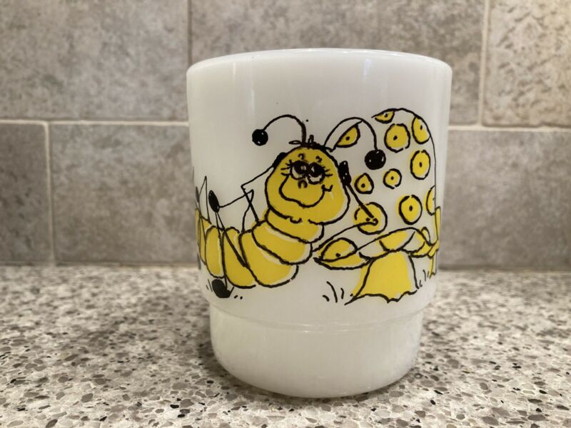 Title (ebay affiliate link): Vintage Anchor Hocking Fireking Hildi Yellow Caterpillar Mushroom Milk Glass Mug