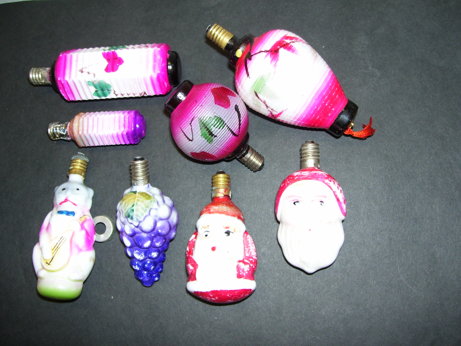 Title (ebay affiliate link): 8 NONWORKING VTG CHRISTMAS C-6 MILK GLASS FIGURAL LIGHT BULBS SANTA CAT GRAPES